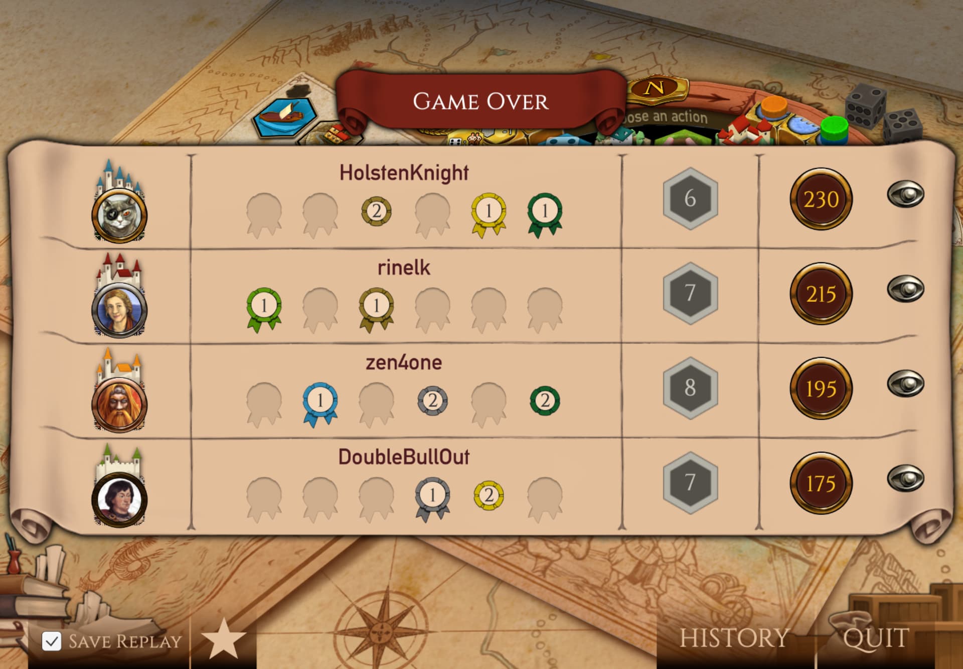Congrats, @HolstenKnight and well played! I was in it for a while, and then made a dumb, fatal error in the 4th round picking a building that I couldn’t use. No way to keep up with a max of 2 open slots for staging tiles. Lesson learned for the next tournament.