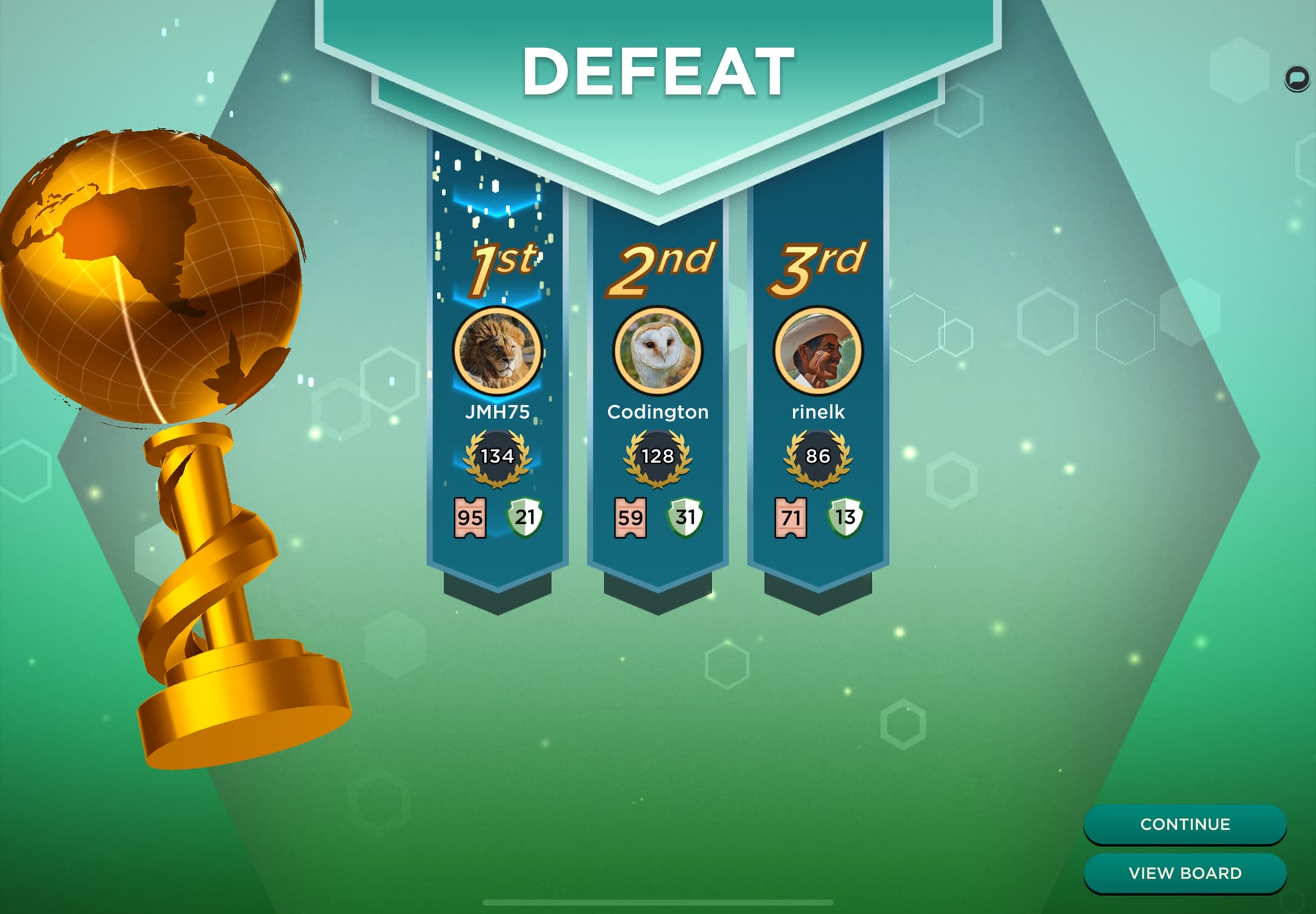 Good game! I knew I could trickle over the finish line, but I was worried if I overcommitted to that you might overtake me if someone pushed break. I ended up trickling a little slower, but it got me to the same place…