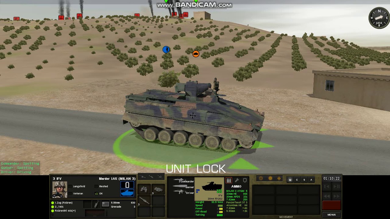 The Marders are going to stagger their advance, alternating their movement between top speed and careful hunting, with different Marders moving at different times, and different movement types when they are moving. I want them to spot enemy armour first and get rounds down ASAP, and I want any contact to have more than one Marder engaging it within seconds. The Marders have 6 Milan missiles each, so that’s plenty to stand off and take the Syrian armour force apart. Depending on how it develops, the infantry can jump out if it turns into an armour duel, or stay on board if the Marders have an easy ride.