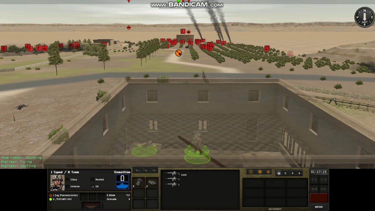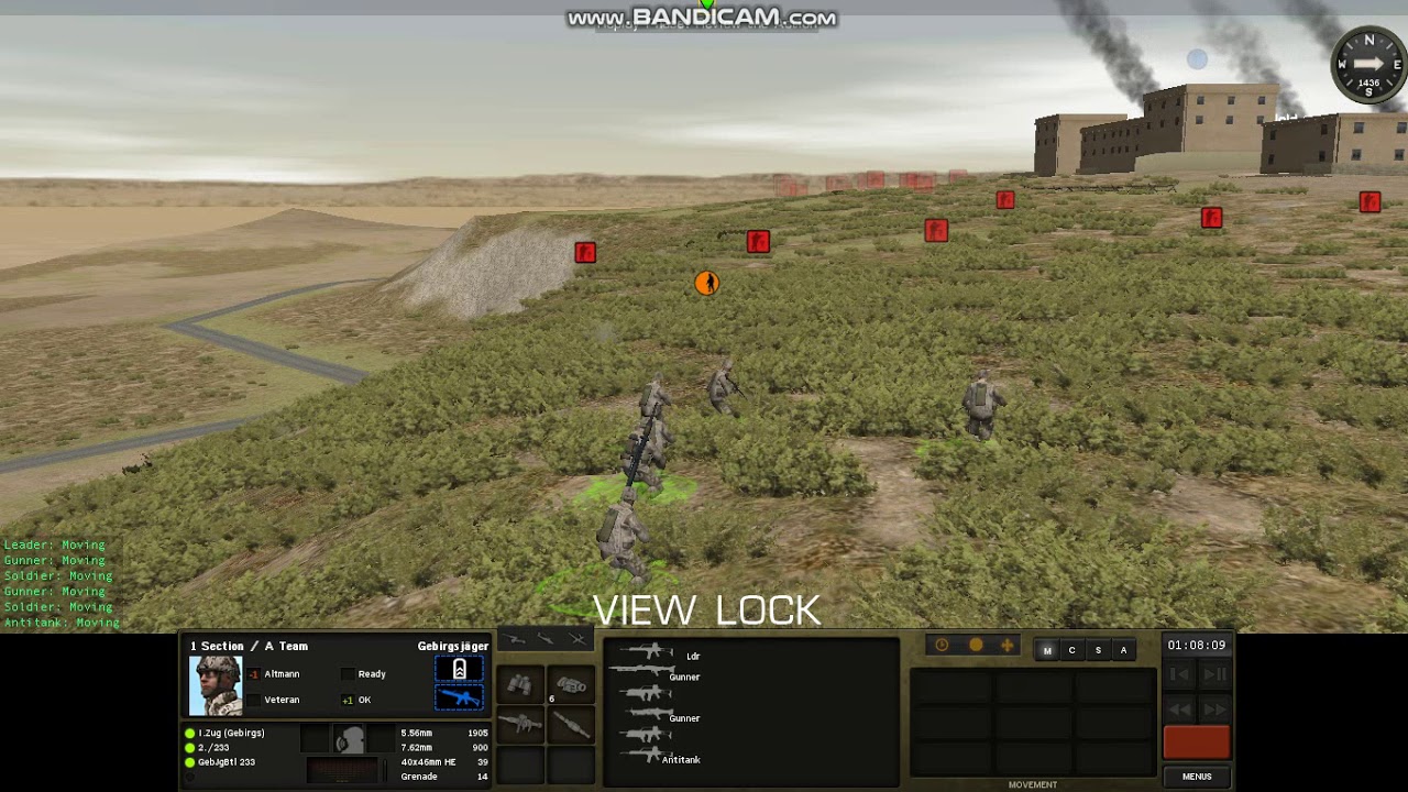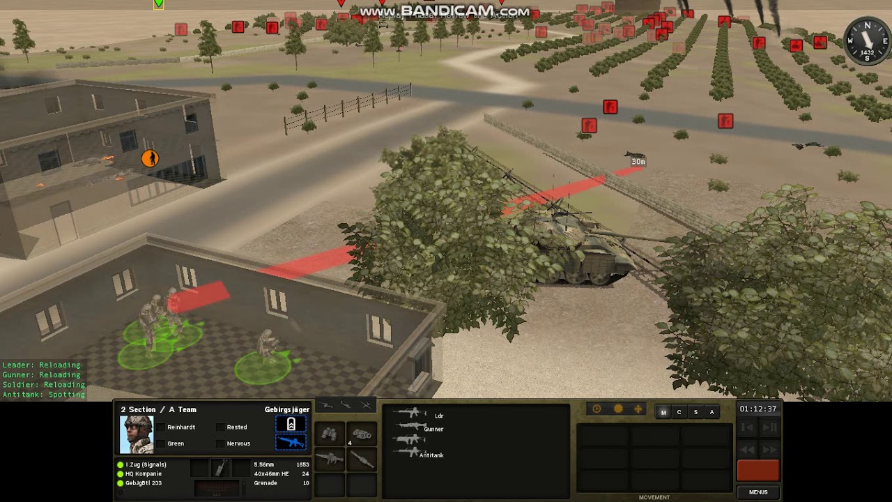The Panzergrenadier squad disembarks and takes up position on a nearby roof, covering the south-west corner of the hill. They have several AT rockets ready, should the Marder need help.
