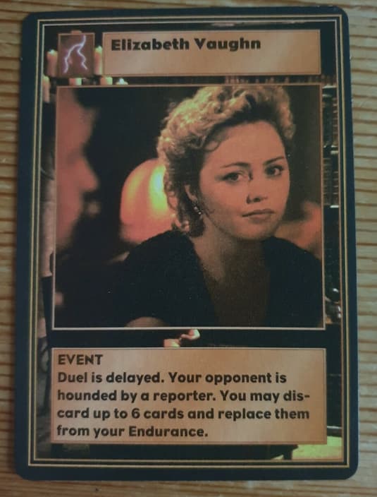 If you’re reading this card as saying that a reporter starts asking questions, preventing you from having a deadly sword fight, yes, that’s the Highlander ccg. Lots of long swords, penetrating wounds, and the main resources were Endurance and Exhaustion, thus making every turn sound sexual. Great stuff.