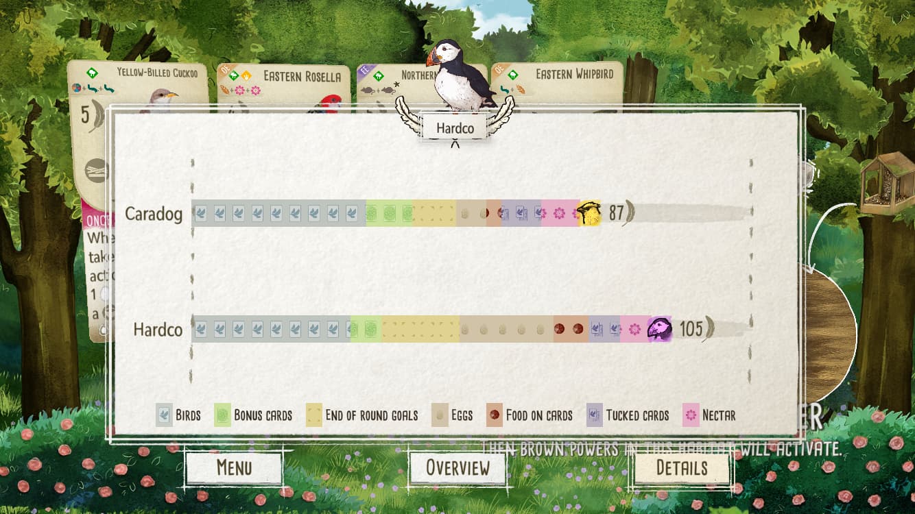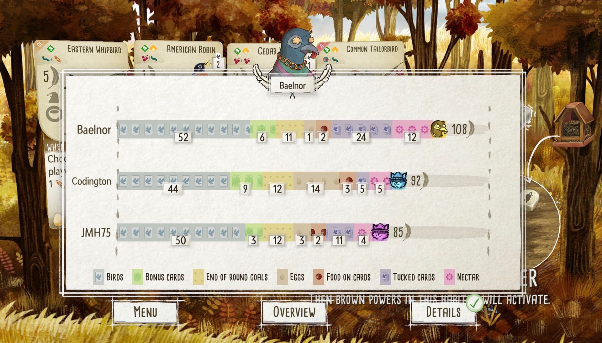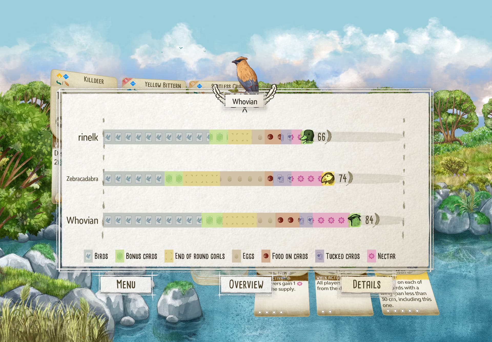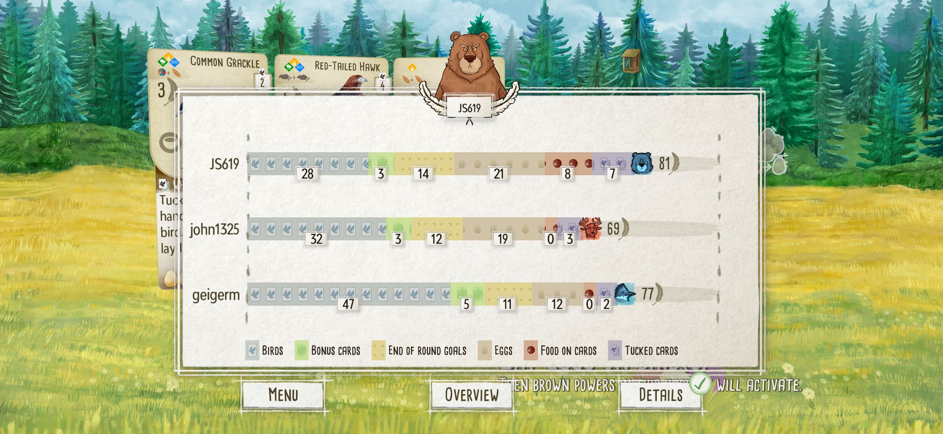 I messed up a few turns (I probably always do!) but never would’ve caught Dave. ‘Grats on the win and gg all! Wingspan definitely one of my favorites and will always play if given the opportunity.