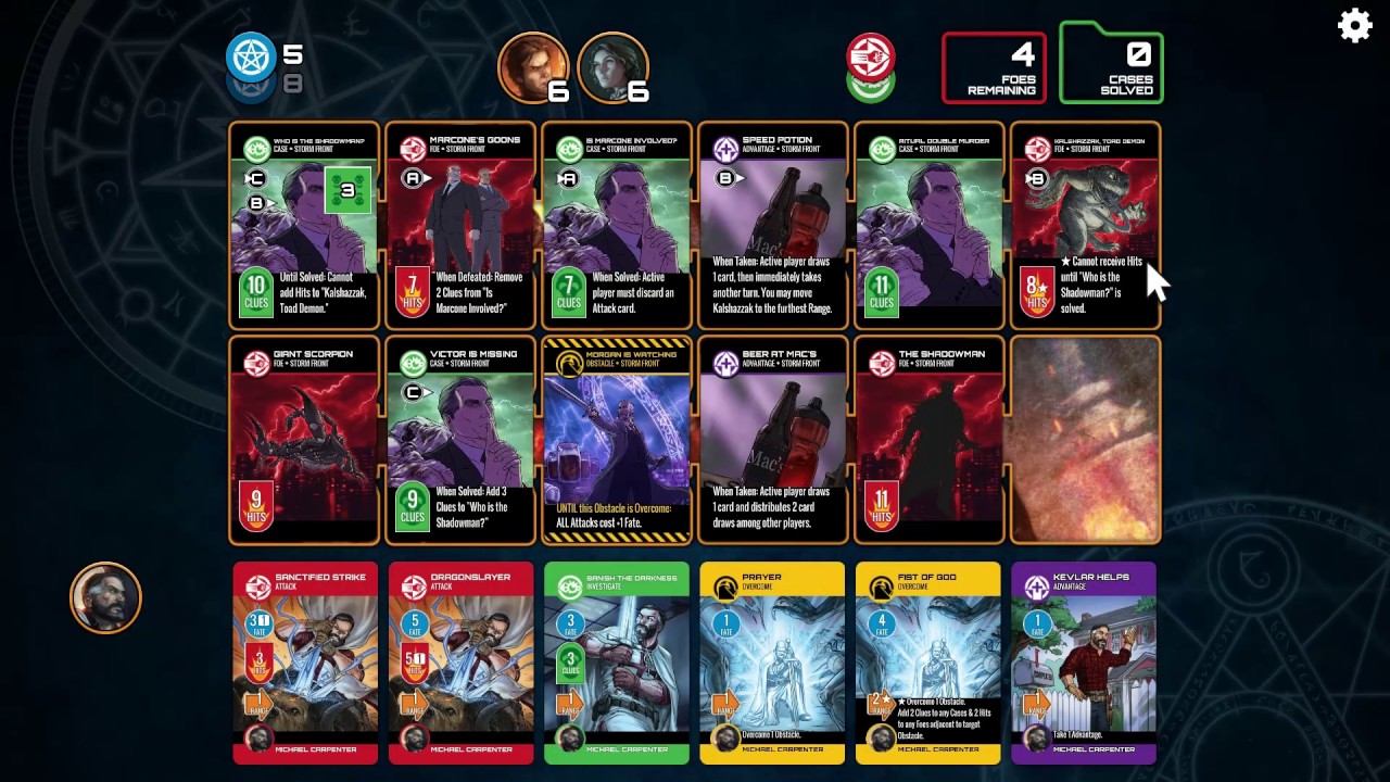 This is a tightly tuned, strategic, cooperative game that feels intense, vital, and a little bit risky (thanks to dice and other factors) throughout play. At 30 minutes per session, gameplay is fast-paced and down to the wire. In this game, players take on the role of Harry Dresden and his allies, investigating cases and taking on foes from the books. To accomplish this, you'll share a common pool of action points (called Fate points), and each player must choose between taking an action or generating Fate points each turn. Solve more cases than there are foes left standing to win!Sure, it sounds a bit like copy, but it also reminds me of another game that Kelsey and I have been playing way too much of lately, Arkham Horror: The Card Game. That one, as far as we know, isn't coming to digital any time soon, so bring on The Dresden Files Cooperative Card Game [do I really need to keep typing that? -ed.].