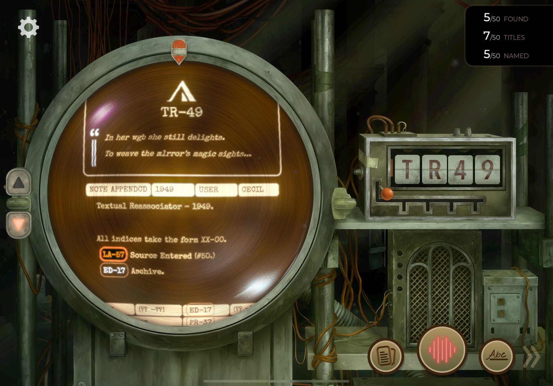 TR-49, Inkle’s latest playable-novel-puzzle thing. I’m just over 10% in as you can see, and am thoroughly hooked. Atmospheric microfiche archive diving may not sound promising, but it works. It’s been compared to Obra Dinn, and I also get The Room vibes from it. Recommended so far.